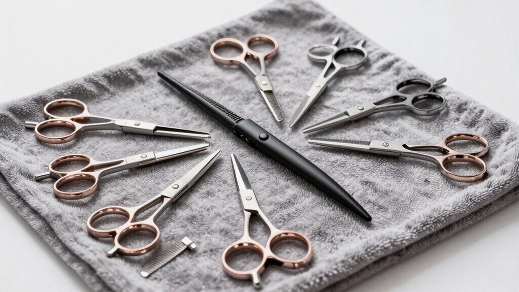 You’ll want to check the blade material quality first—high-grade stainless steel keeps edges sharp and resists rust. Look for ergonomic handle designs that reduce hand fatigue during long grooming sessions. Also, make sure the kit offers a good mix of scissor types, solid sharpness, precise cuts, and durable, coated blades that’ll last.