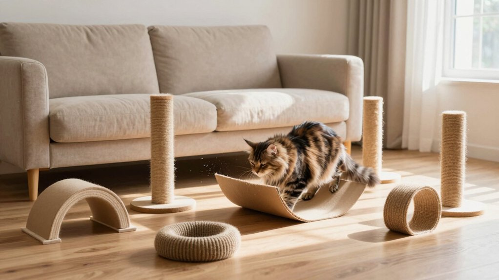A well-designed cat scratcher does more than just survive your cat’s claws—it adapts to their habits and your home. You’ll want one that doubles as a lounging spot, so your cat can scratch, stretch, and relax all in one place. Choose models with upright, horizontal, or curved surfaces to match your cat’s preferred scratching style. Scratchers with built-in toys boost play and mental stimulation, keeping boredom at bay. Pick materials like corrugated cardboard that mimic tree bark—it feels great to your cat and supports healthy claw wear. Opt for designs that fit snugly against walls or furniture; they’re easier to position and help shield your couch. Make sure it’s lightweight or stable enough to stay put when used. A versatile, functional scratcher doesn’t just protect your space—it fits into it seamlessly.