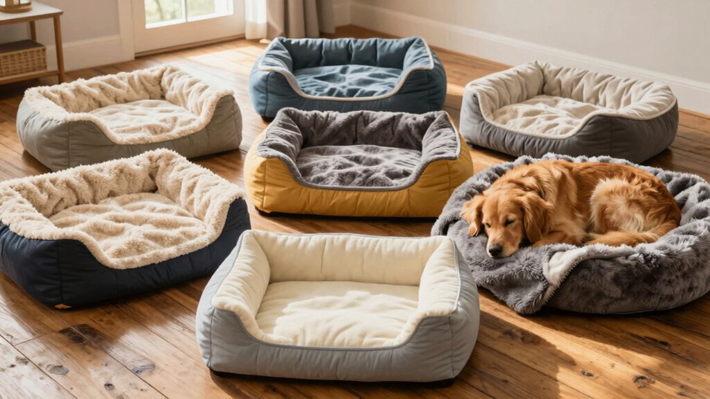 Most top-rated dog bed blankets rely on durable, well-chosen materials that stand up to daily wear while keeping your pup cozy. You’ll want to pick one made from high-quality fabric that handles scratching, digging, and regular use without falling apart. Soft materials like fleece, microfiber, and sherpa feel great against your dog’s fur and provide warmth they’ll love. Look for reinforced stitching and edge binding—it keeps the blanket from fraying and adds lasting strength. Breathable fabrics help regulate temperature so your dog doesn’t overheat. Plus, you’ll appreciate machine-washable materials since they make cleanup fast and simple. Choosing a well-made blanket means your dog stays comfortable and you get long-term value. Focus on fabric quality and construction details—you’ll both notice the difference.
