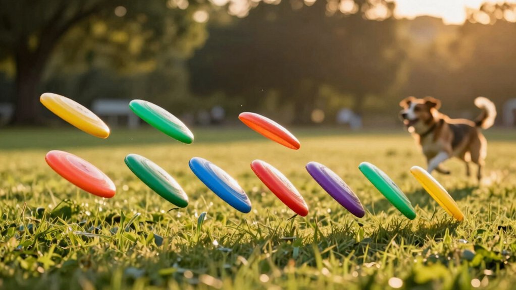 Visibility starts with color—bright orange, blue, green, or yellow discs stand out sharply against grass, sand, and sky, so your dog can track them mid-flight. High-contrast patterns boost detection, especially over water or uneven terrain. You’ll want a disc large enough to spot easily, since bigger shapes hold visual attention longer in the air. If you play at dusk or night, pick discs with reflective trims or built-in lights—these keep the flight path visible and reduce search time. Always check how the disc looks in your usual play environment; colors can fade or blend in ways you don’t expect. You’re aiming for instant recognition the moment it leaves your hand. A highly visible disc means fewer missed catches, less frustration, and safer, more fun sessions. Watch how your dog reacts—you’ll see the difference clear visibility makes.