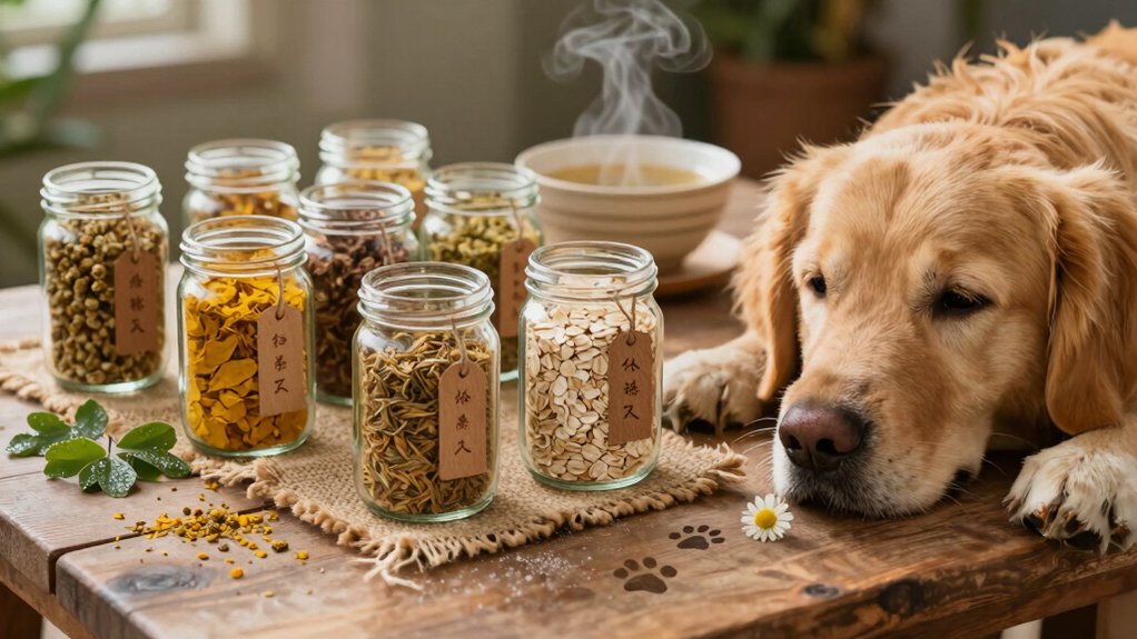 When selecting a dog herbal supplement, start by checking the active ingredients for proven benefits that match your pet’s needs. Look for quercetin to support immunity and ease allergies. If your dog has a sensitive stomach, choose formulas with slippery elm or fennel to soothe digestion. For natural infection defense, ingredients like Echinacea and oregano offer antibiotic-like support. Want to boost resilience? Pick supplements with adaptogens such as astragalus to help your dog handle stress. Don’t overlook omega-rich oils—hemp-derived oils fight inflammation and support joint health. Always verify that each ingredient serves a clear purpose. Skip products with fillers or vague blends. You want transparency and potency. Knowing exactly what’s in the bottle ascertains you’re giving your dog what they truly need. Focus on specific, active components backed by real benefits.