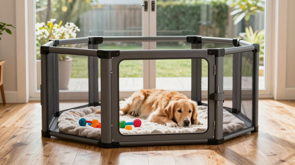 While some playpens work only in controlled indoor spaces, the best options give you the flexibility to move seamlessly between house and yard. You’ll want a model built from durable, weather-resistant materials like rustproof metal or heavy-duty plastic so it withstands sun, rain, and dirt without degrading. Look for designs that offer adaptable configurations—whether rectangular, circular, or modular—so you can adjust the shape for tight corners indoors or open grassy areas outside. You need secure locking mechanisms to prevent escapes, especially when your dog’s more energetic outdoors. Stability matters too; wobbly panels won’t cut it on uneven terrain. Choose a playpen that sets up and folds down fast, so shifting from living room to backyard isn’t a hassle. You’ll get the most use when indoor-outdoor shifts are simple, functional, and safe.