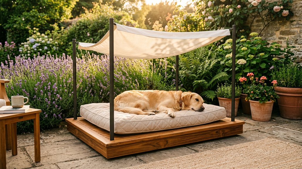 What makes a canopy truly effective for your pet’s outdoor retreat? You need shade that blocks UV rays and cuts heat, keeping the bed cool. Look for weatherproof or sunproof fabrics that resist rain, wind, and harsh sunlight. Water‑resistant, UV‑stable material preserves durability and prevents fading. Removable or adjustable canopies let you switch between a fully shaded nook and an open‑air bed, giving flexibility for changing weather. Integrated shade panels should extend over the entire sleeping area, reducing direct solar heating on the elevated platform. Ensure the canopy attaches securely yet can be taken down for cleaning or storage. A well‑designed canopy protects your pet, extends the bed’s life, and enhances comfort during sunny days.