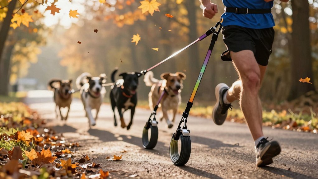 You need a leash built for two if you’re walking dual dogs—don’t risk tangles or lost control with a setup not designed for the job. Choose a model made specifically for dual dog compatibility to keep both pups secure and your walk smooth. Look for an adjustable waist belt that fits comfortably, so you stay stable no matter their sizes. A dual bungee system absorbs shock when both dogs pull, reducing strain on your back. Multiple control handles let you grab either dog quickly in emergencies. Reflective stitching boosts visibility when you’re out at dawn or dusk. You’ll want these safety features when jogging or walking in low light. Don’t settle for a single-dog leash modified for two—get one engineered for dual control. Your comfort and their safety depend on it.