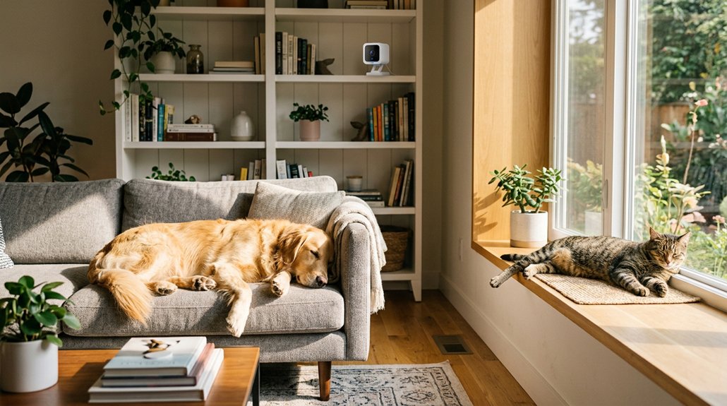 Monitoring your pets from anywhere starts with picking the right indoor security camera. You’ll want to look for features like AI pet detection, auto-tracking, two-way audio, and reliable night vision ranging from 15 to 30 feet. Options range from budget-friendly 1080P cameras like the TP-Link Tapo C100 to advanced 4K models with auto-tracking like the Anona. Local microSD storage and smart home compatibility with Alexa or Google Assistant also matter. Keep scrolling to find your perfect match.