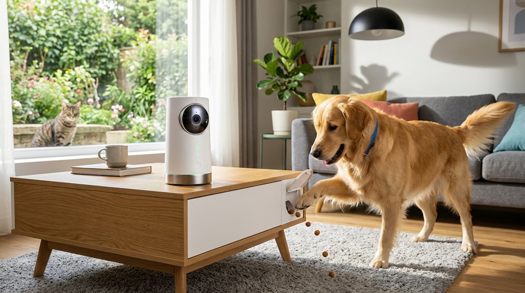 You’ll love the crystal‑clear 2K video and 360° coverage that let you keep an eye on your pet from any angle, while the built‑in treat dispenser tosses snacks remotely with a tap. Models like the Furbo Mini 360°, Furbo 360° Dog, and Petcube Bites 2 Lite combine auto‑tracking, night vision, and two‑way audio for seamless interaction. Most support dual‑band Wi‑Fi, Alexa/Google integration, and local or cloud storage options. Keep scrolling to discover the full top‑10 list and find the perfect fit for your furry friend.