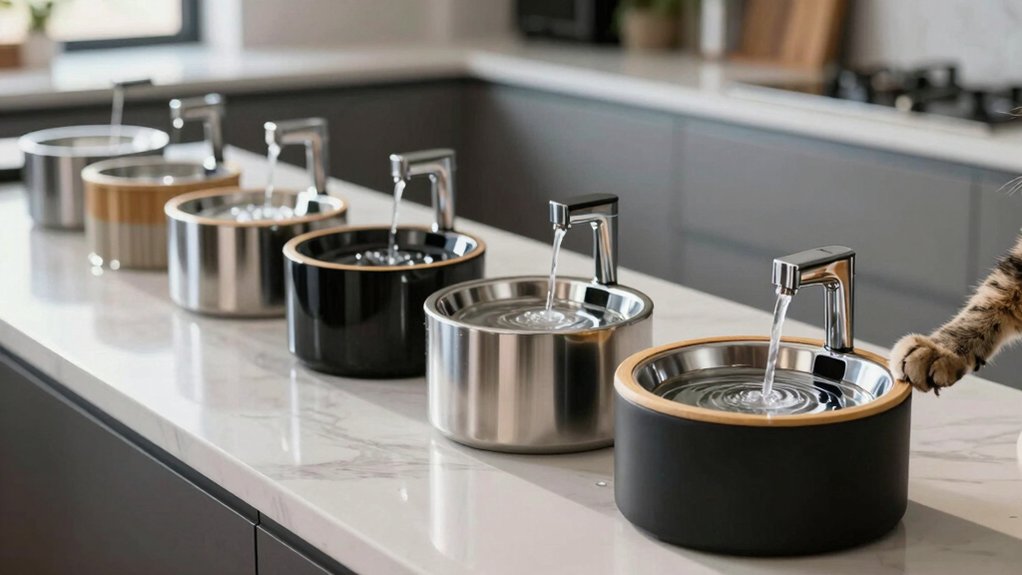 Style matters—your cat’s drinking fountain shouldn’t just perform well, it should look good doing it. You’ll find premium models in natural ceramic, stainless steel, and eco-friendly bioplastics, each blending seamlessly with different home styles. If you love clean lines and calm spaces, minimalist designs or those with Feng Shui-inspired elements enhance tranquility. Glass components and soft LED lighting add a modern flair while letting you easily check water levels. You can choose from finishes and colors that complement your existing decor, turning function into design. Innovative shapes and smooth surfaces reduce splashes, keeping the area neat and visually tidy—perfect for open or shared spaces. When you pick a fountain with strong aesthetic appeal, you’re not just caring for your cat—you’re elevating your home’s vibe, one stylish sip at a time.